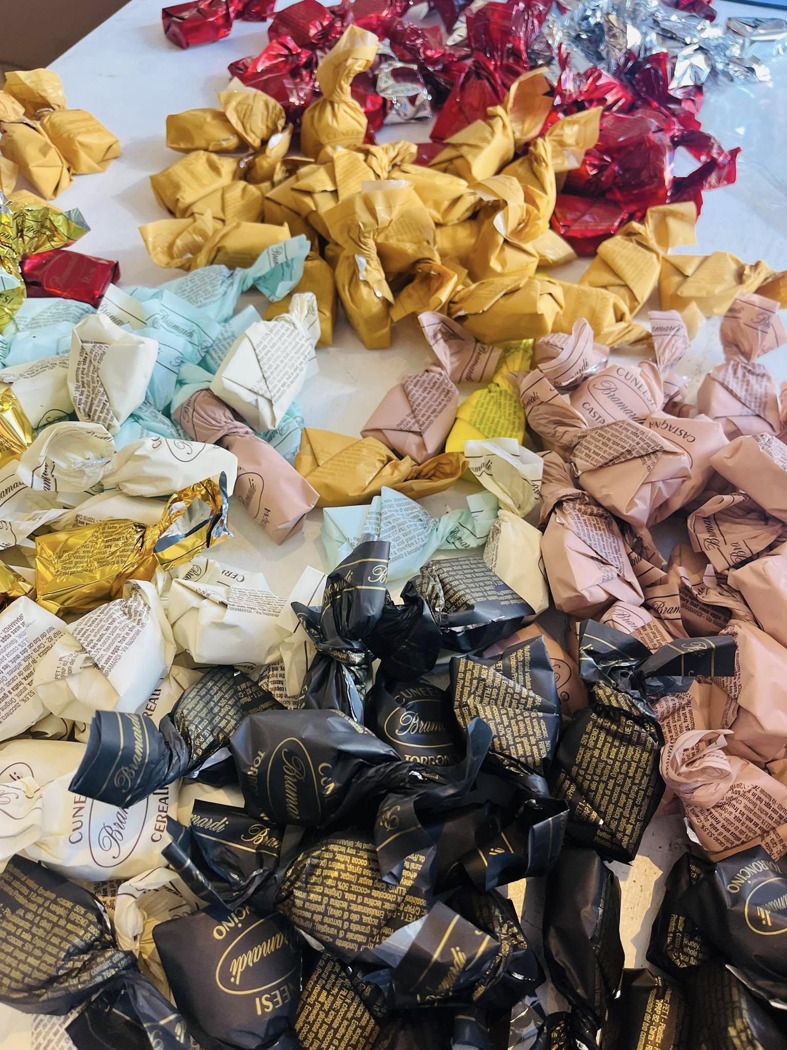 Vi har de populære” Cuneesi” chokolade i forskellige farver og smage, trøffelchokolade, gianduiotti, Piemonte hasselnødder i flere varianter m.m.